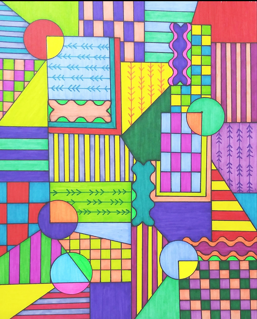Alternating colors With plaids of two or three Various shapes in the mix Makes such a vivid piece Oh so colorful